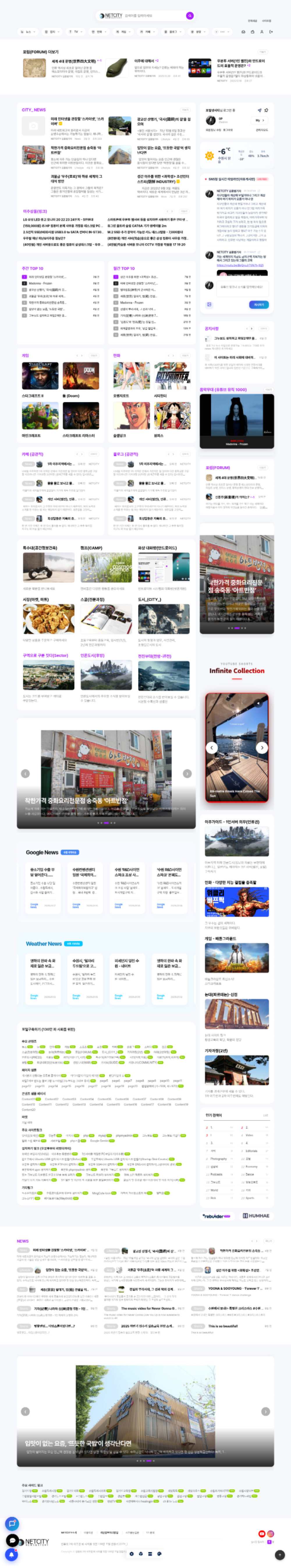 검색, 메일, 커뮤니티 등 **'다양한 서비스의 집합체'**입니다. 구조적 특징: 매우 복잡하며, 사용자 개인화 영역(로그인 후 대시보드)이 중요합니다.핵심 기능: 통합 검색 엔진, 광고 배너 관리 시스템, 사용자 맞춤형 위젯.그누보드 활용: 그누보드 단일 엔진보다는 여러 개의 그누보드 인스턴스를 연결하거나, 별도의 검색 엔진 API를 연동하여 거대한 시스템을 구축합니다.